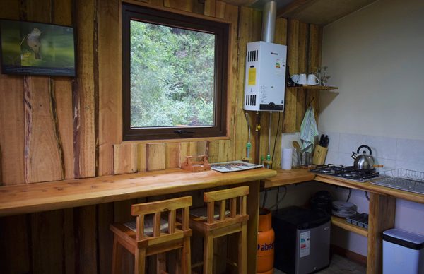 Cabaña equipada full para 2 personas. Cuenta con cama matrimonial. Calefacción con sistema Toyotomi. Ideal para parejas.