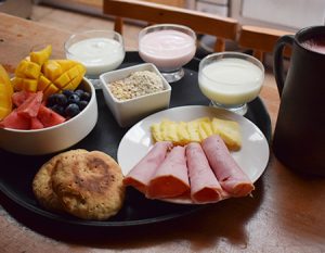 • Campestre: Huevos (de nuestras gallinas) o palta, mermelada casera, jamón o queso, yogurt con granola y fruta estacional, pan. amasado elaborado por nosotros am. Café de