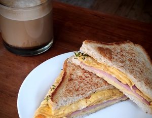 • Americano: Pan de molde con huevo (de nuestras gallinas) tipo omelette + jamón + queso y ciboulette. Café de grano, té o leche a elección. $5.500.